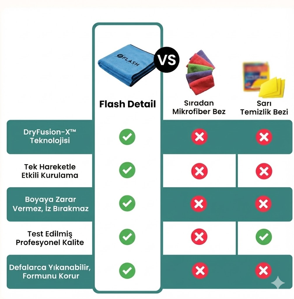 Flash Bez, özel olarak geliştirilmiş mikrofiber yapısı sayesinde araç boyası, camlar, plastik aksamlar, krom parçalar ve jantlar dahil olmak üzere aracınızın tüm dış ve iç yüzeylerinde güvenle kullanılabilir. Yüzeyde kesinlikle çizik, hare veya su lekesi bırakmaz, parlak bir sonuç sağlar.